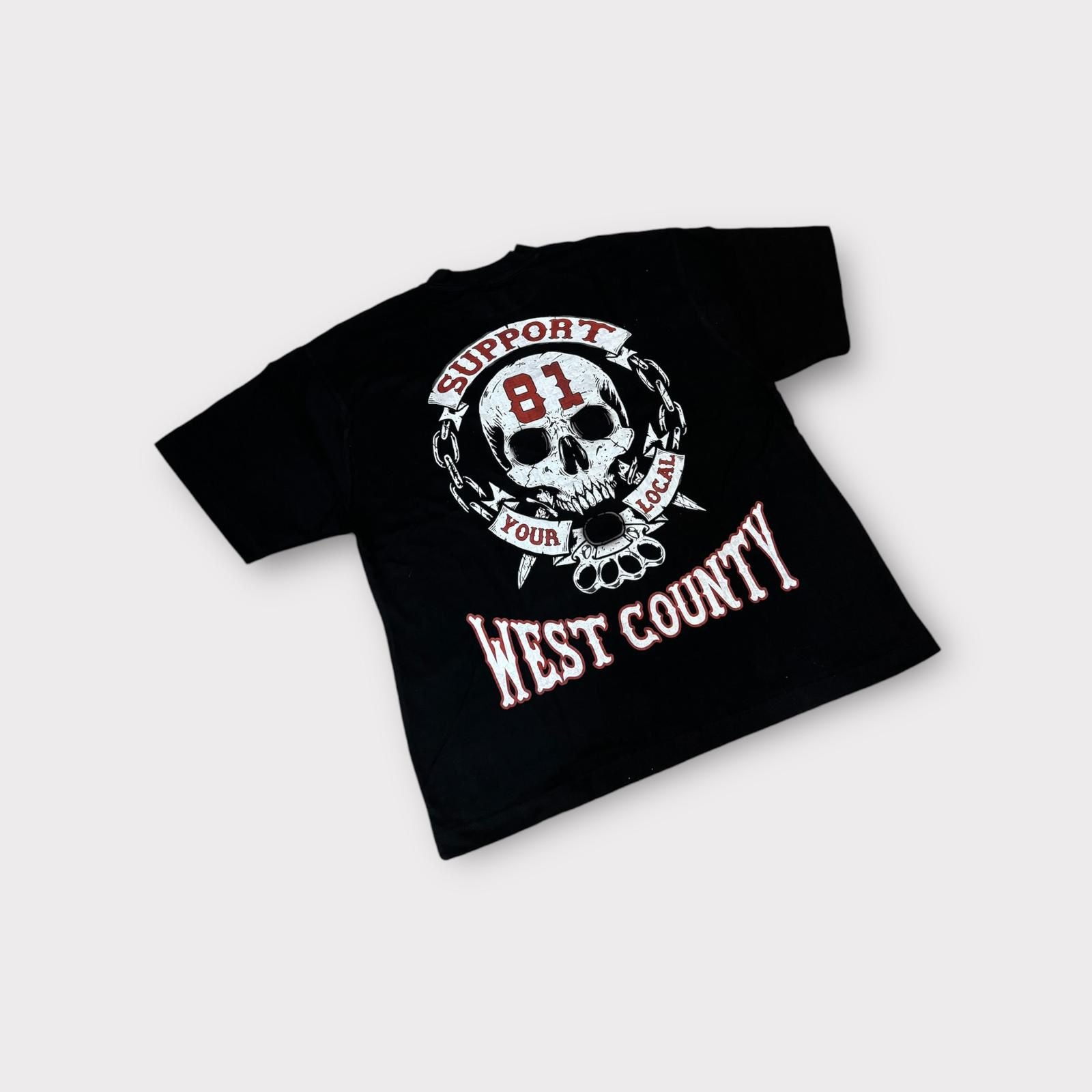 Das SYL West County T-Shirt „Support 81 Your Local“ ist ein kompromissloser Statement-Piece für echte Szene-Anhänger. Das Shirt in tiefem Schwarz besticht durch einen großflächigen Frontprint: Ein bedrohlicher Totenkopf, umrahmt von einer stählernen Kette, knallroten „81“-Ziffern auf der Stirn und geschwungener Schrift „Support Your Local“ darüber. Darunter prangt in derselben markanten „West County“ Schriftzug. Dieses T-Shirt richtet sich an Biker, Rocker und alle, die ihre Zugehörigkeit zur West County-Familie plakativ nach außen tragen möchten.