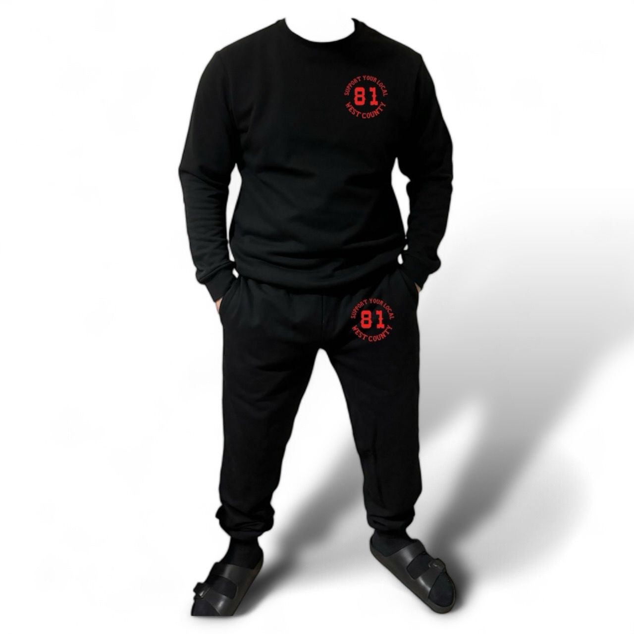 Mit unserem SYL West County Sweatsuit präsentierst du kompromisslos deine Zugehörigkeit zur Straße – egal, ob du auf dem Bike unterwegs bist oder einfach nur lässig durch die Hood chillst. Der hochwertige Zweiteiler aus Sweatstoff besteht aus einem klassischen Crewneck-Sweatshirt und einer dazu passenden Jogginghose. Beide Teile sind in tiefem Schwarz gehalten und tragen das markante „81 West County“-Logo in knalligem Rot.